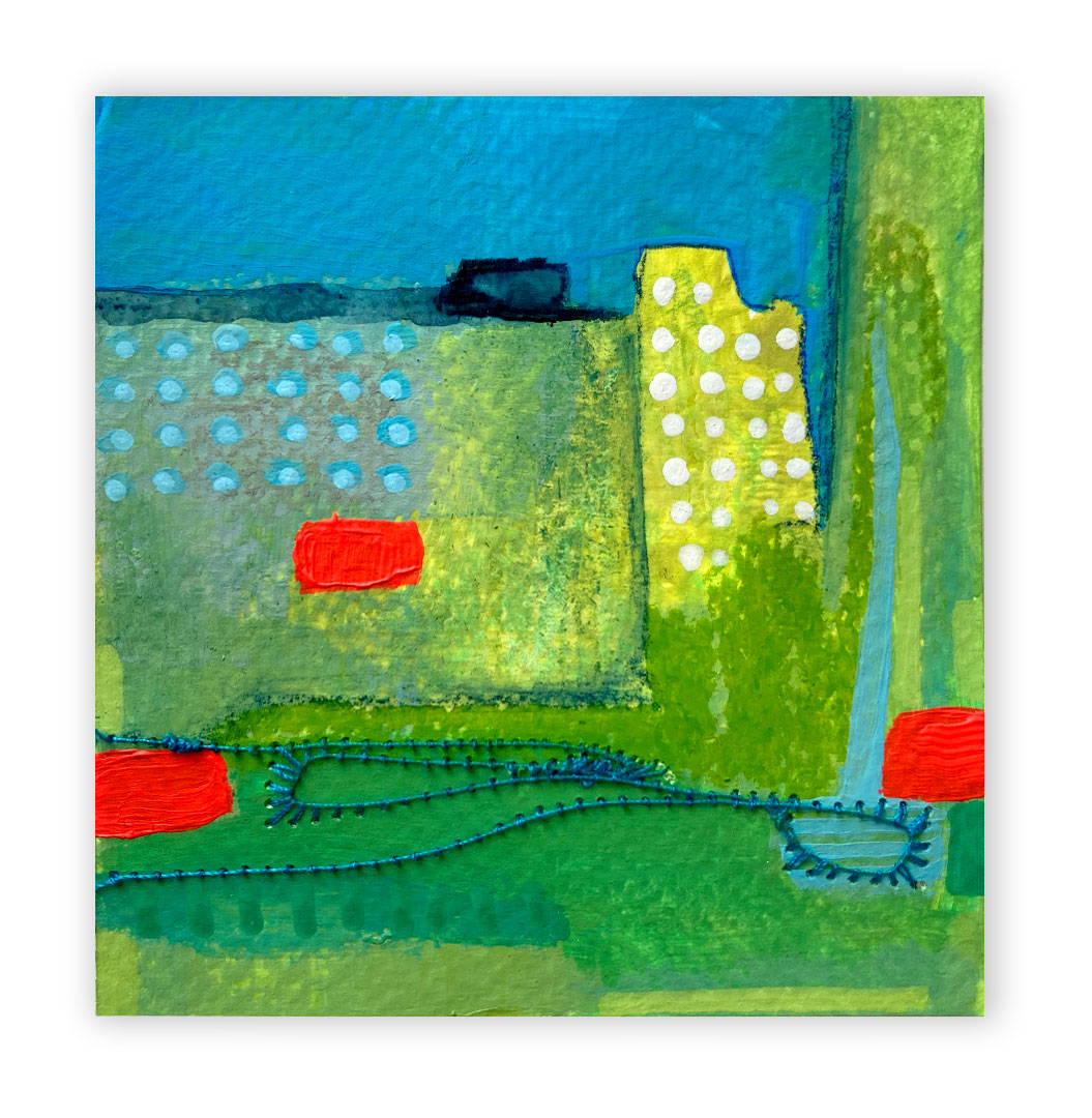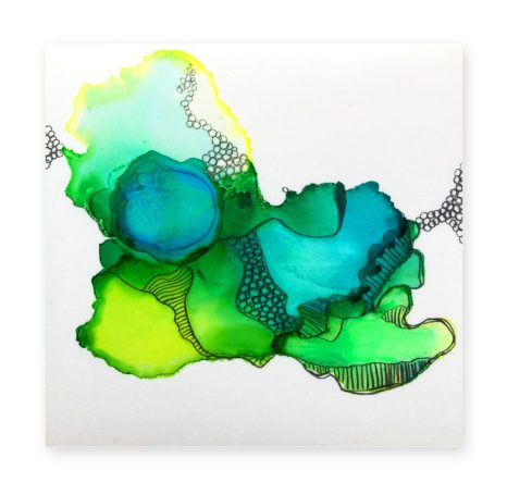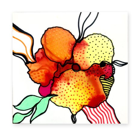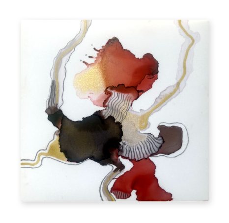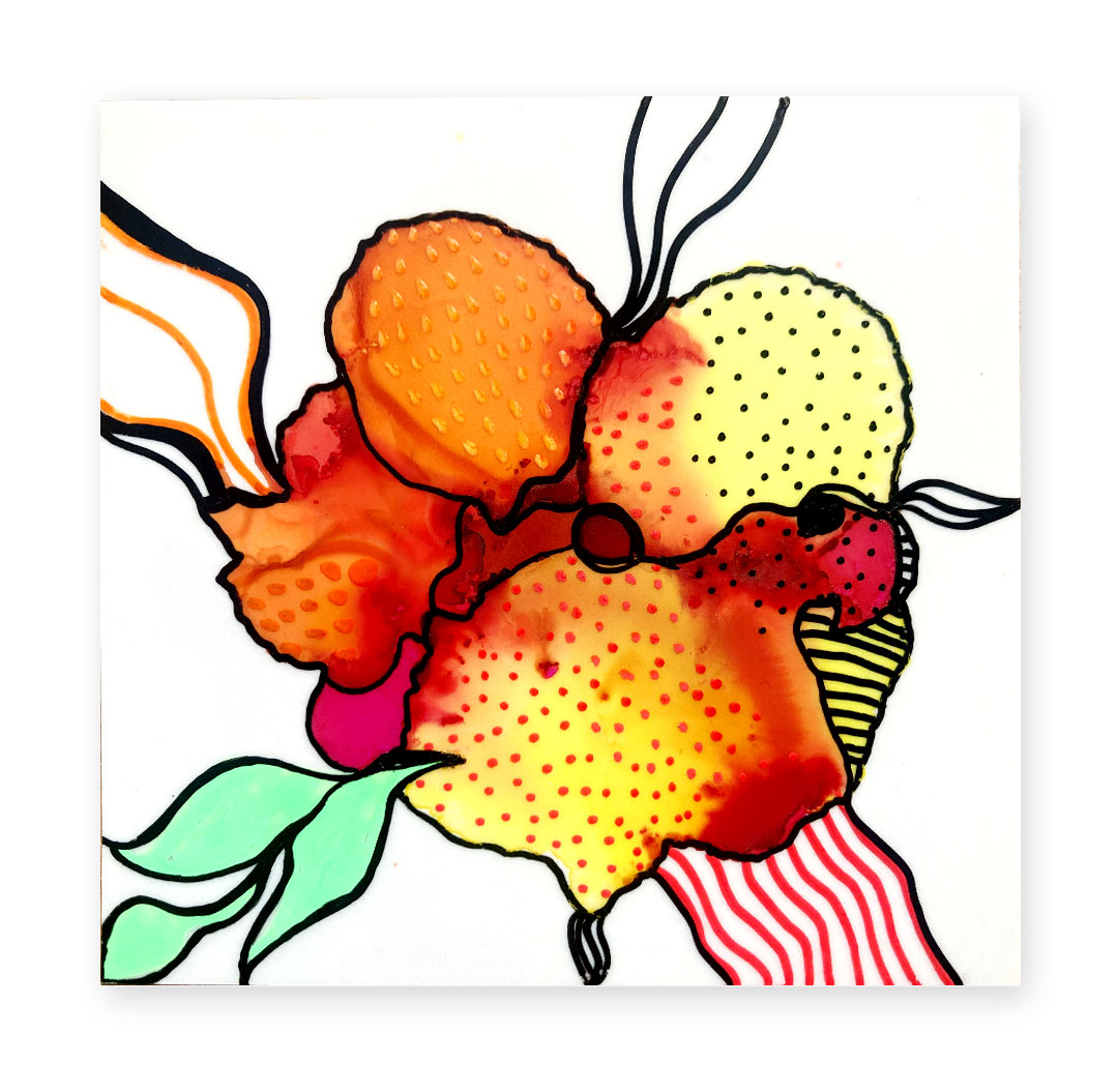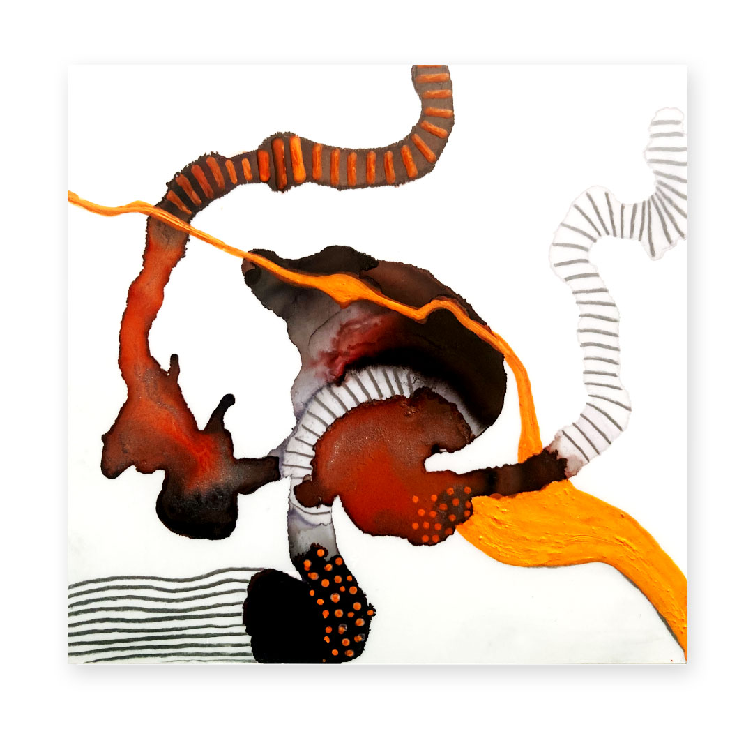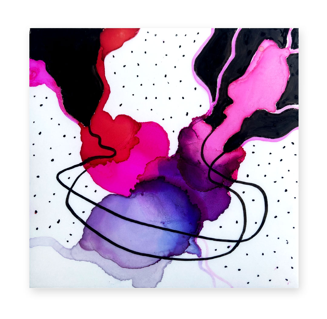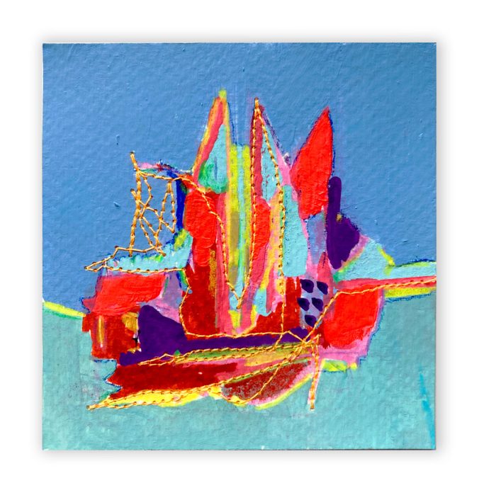 J’explore différentes techniques tel le collage, la peinture, les encres à l’alcool, la broderie et la couture.