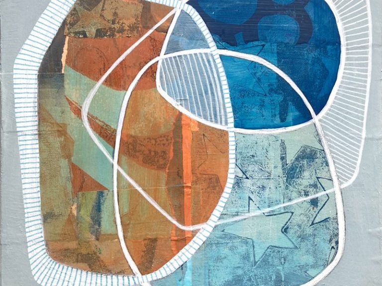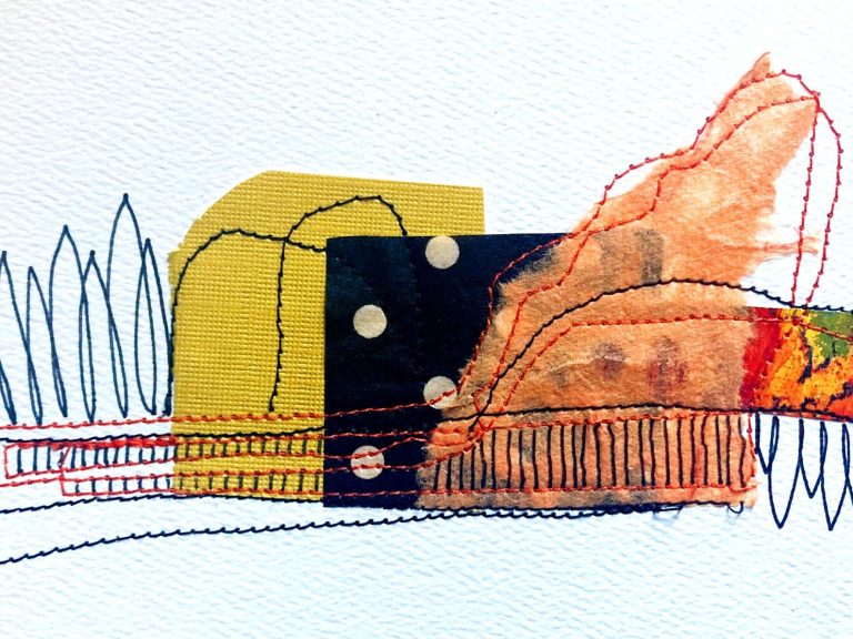 Série d’oeuvres de style abstraites qui intègrent le fils comme éléments graphique créant lignes et dessins et en assemblage à des collages par le médium de la couture ou de la broderie sur toile ou papier.