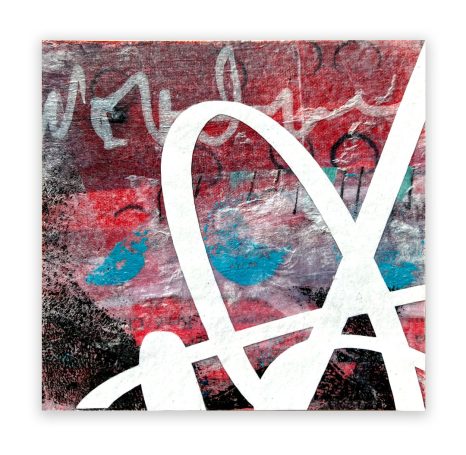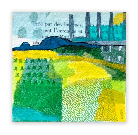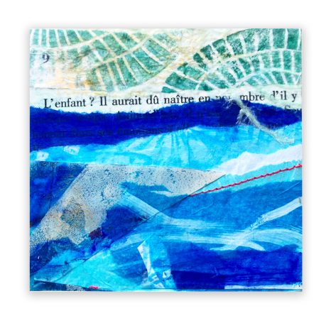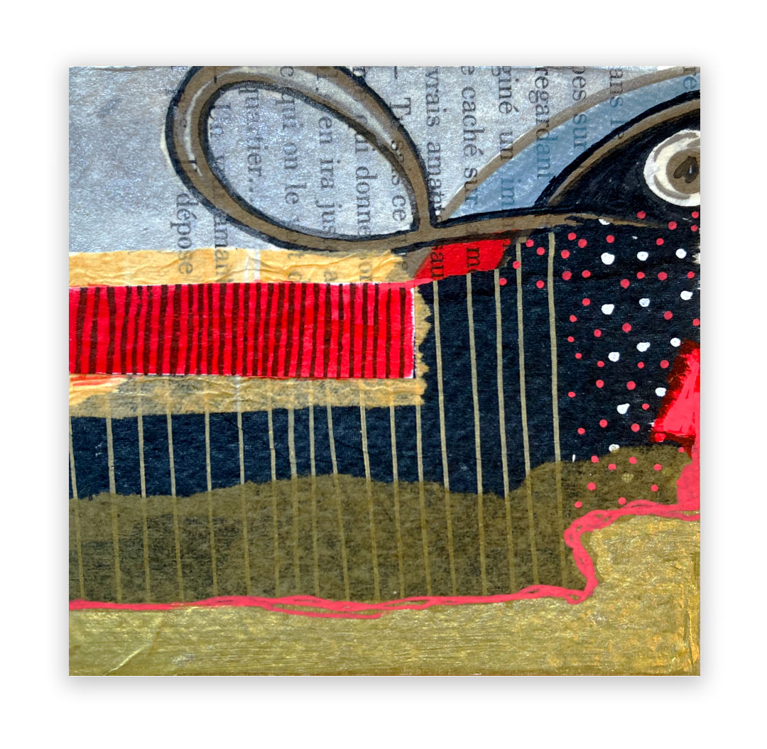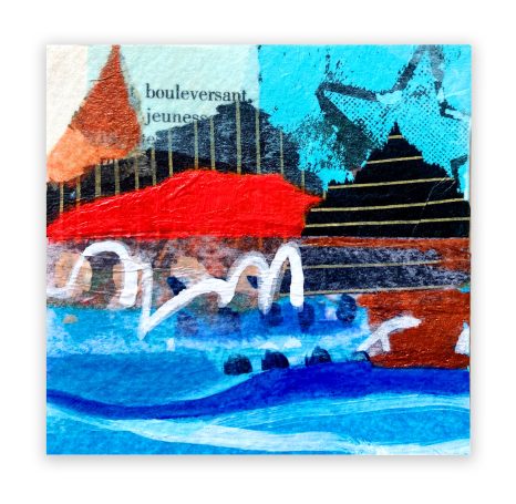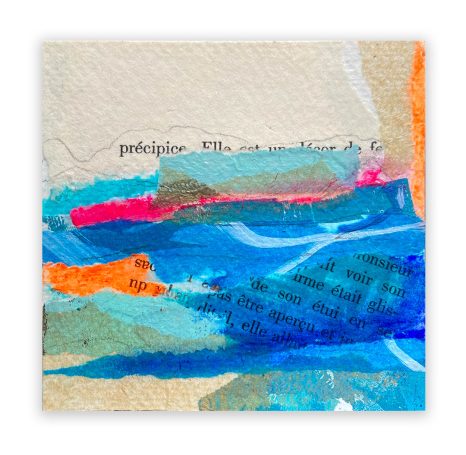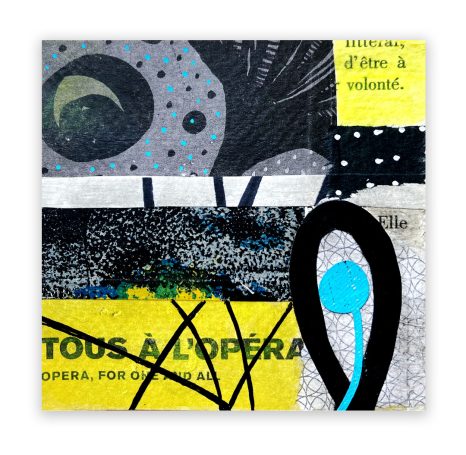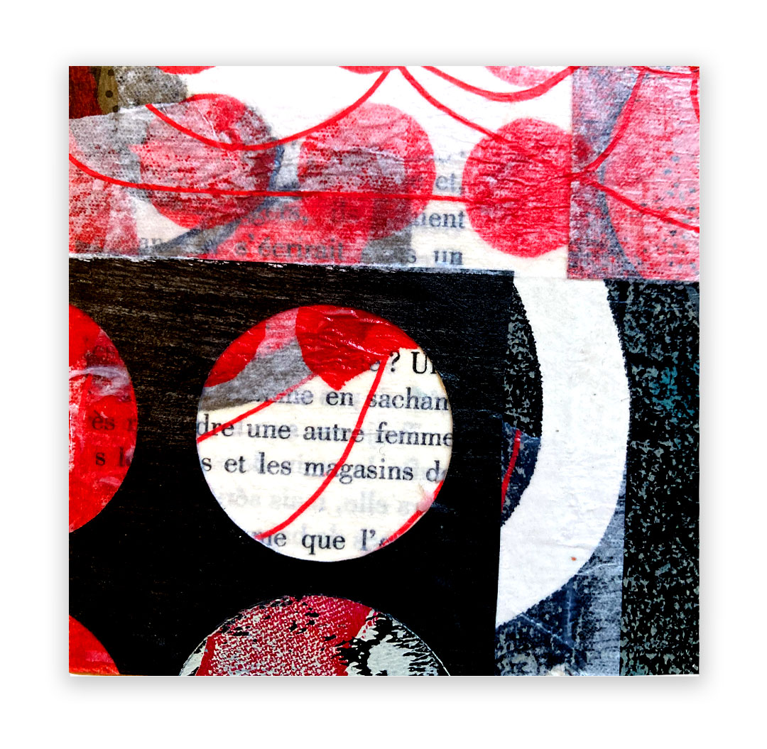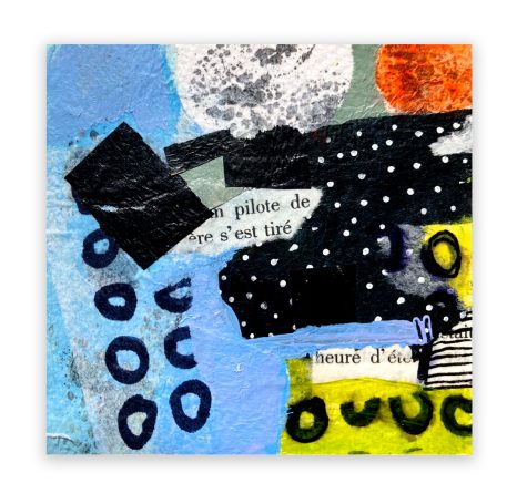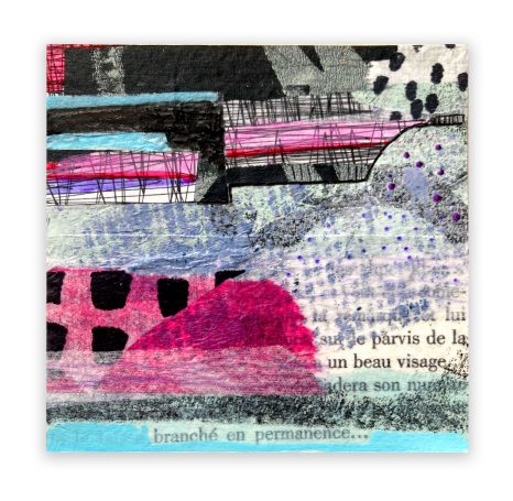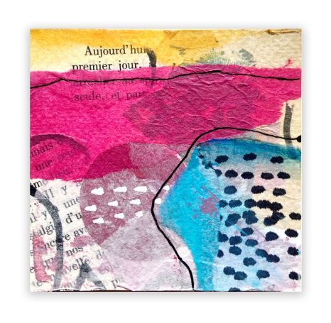 Je crée une petite oeuvre d’environ 3,5 x 3,5 pouces par jour, j’explore différentes techniques tel le collage, la peinture, les encres à l’alcool, la broderie et la couture. Toutes les oeuvres sont disponibles pour la vente